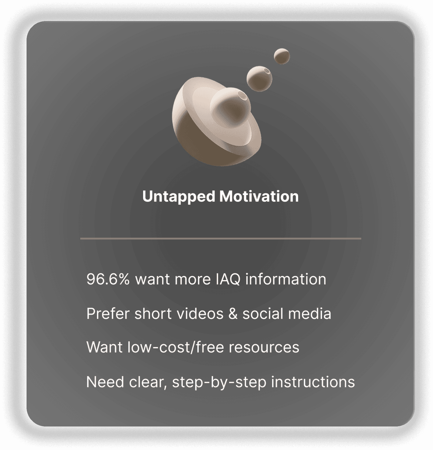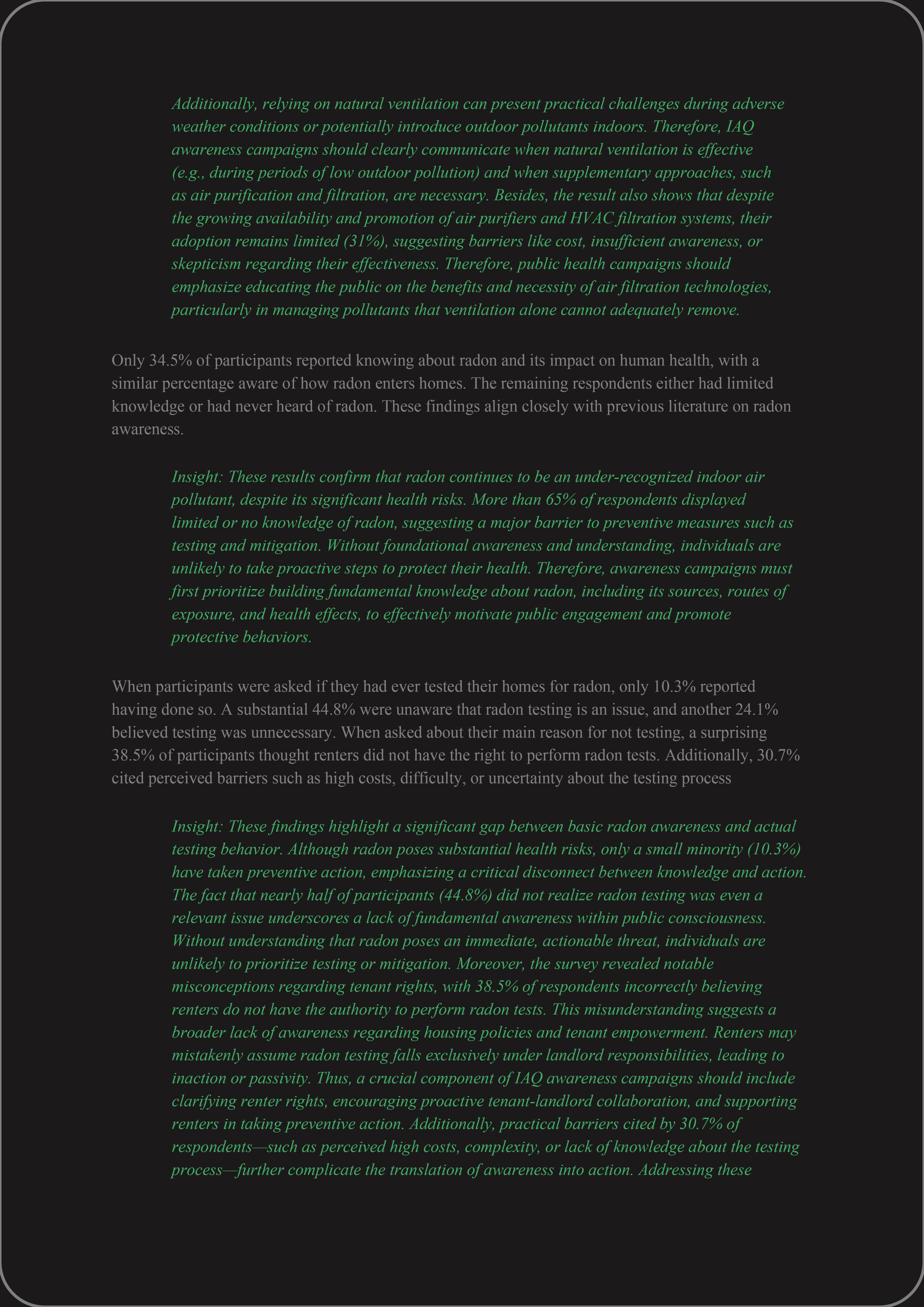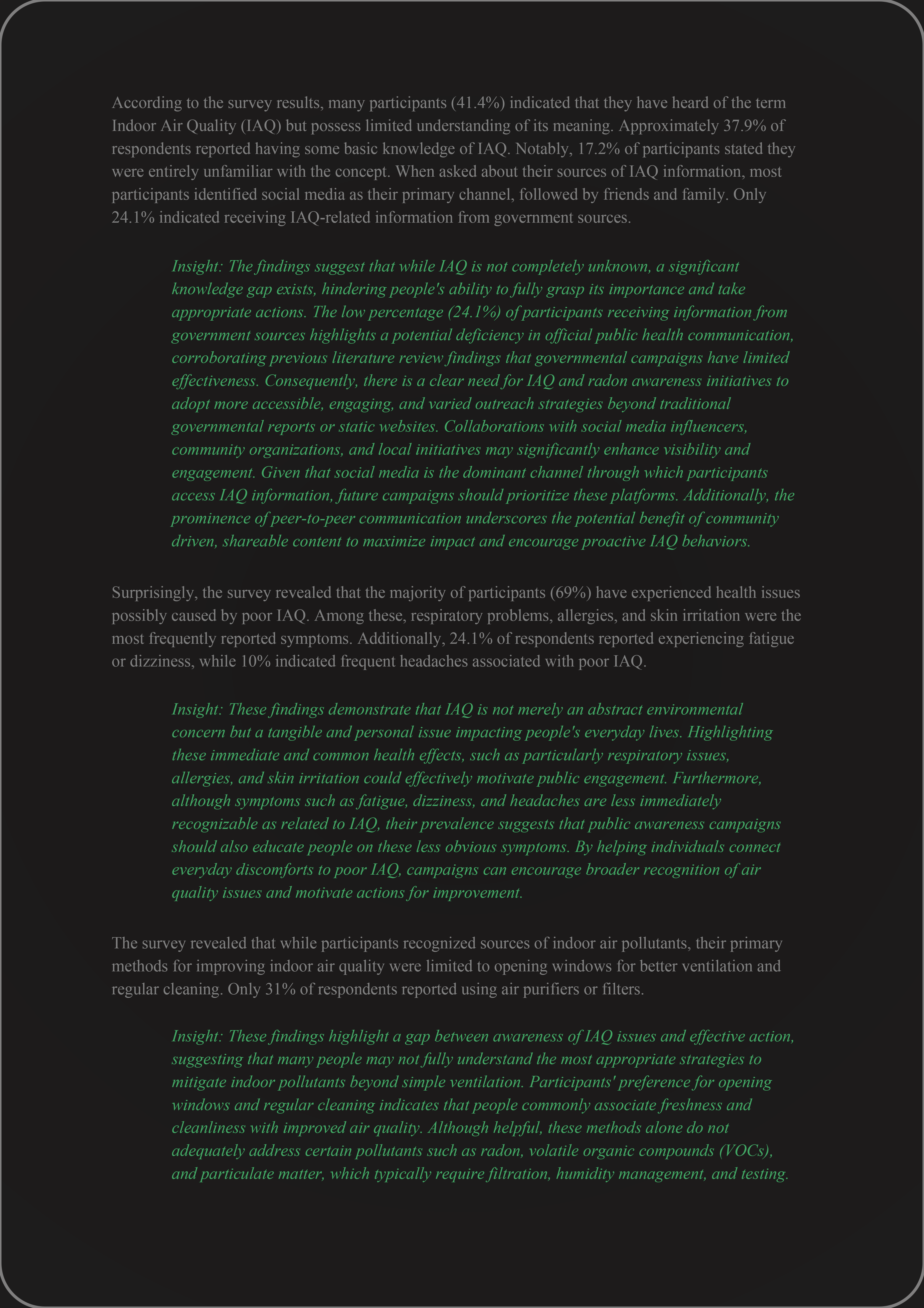 The findings reveal a clear gap between IAQ awareness and action. While people recognize the importance of indoor air quality, many remain confused about specific pollutants, detection methods, and mitigation strategies—especially when faced with financial constraints or unclear guidance. This highlights the need for design-driven educational campaigns that clarify key concepts, correct misconceptions, and provide concrete, actionable steps.