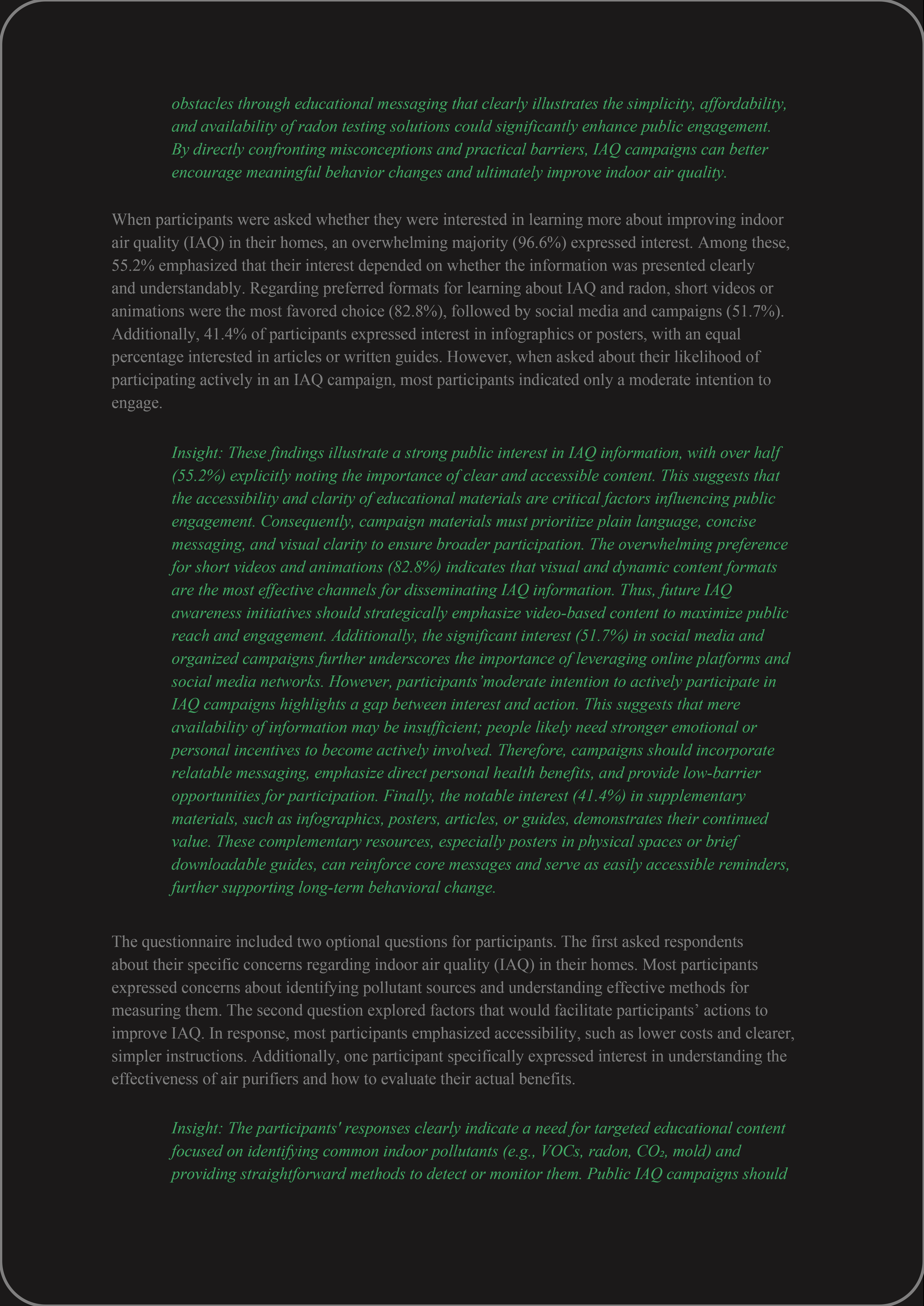 Based on these insights, effective campaigns should deliver clear, engaging, and action-oriented information through accessible formats such as short videos, infographics, and social media. Campaigns should build foundational understanding of IAQ and radon, promote practical and low-cost actions, simplify radon testing—particularly for renters—and use storytelling and visual design to make invisible risks tangible and personally relevant, encouraging sustained behavior change.