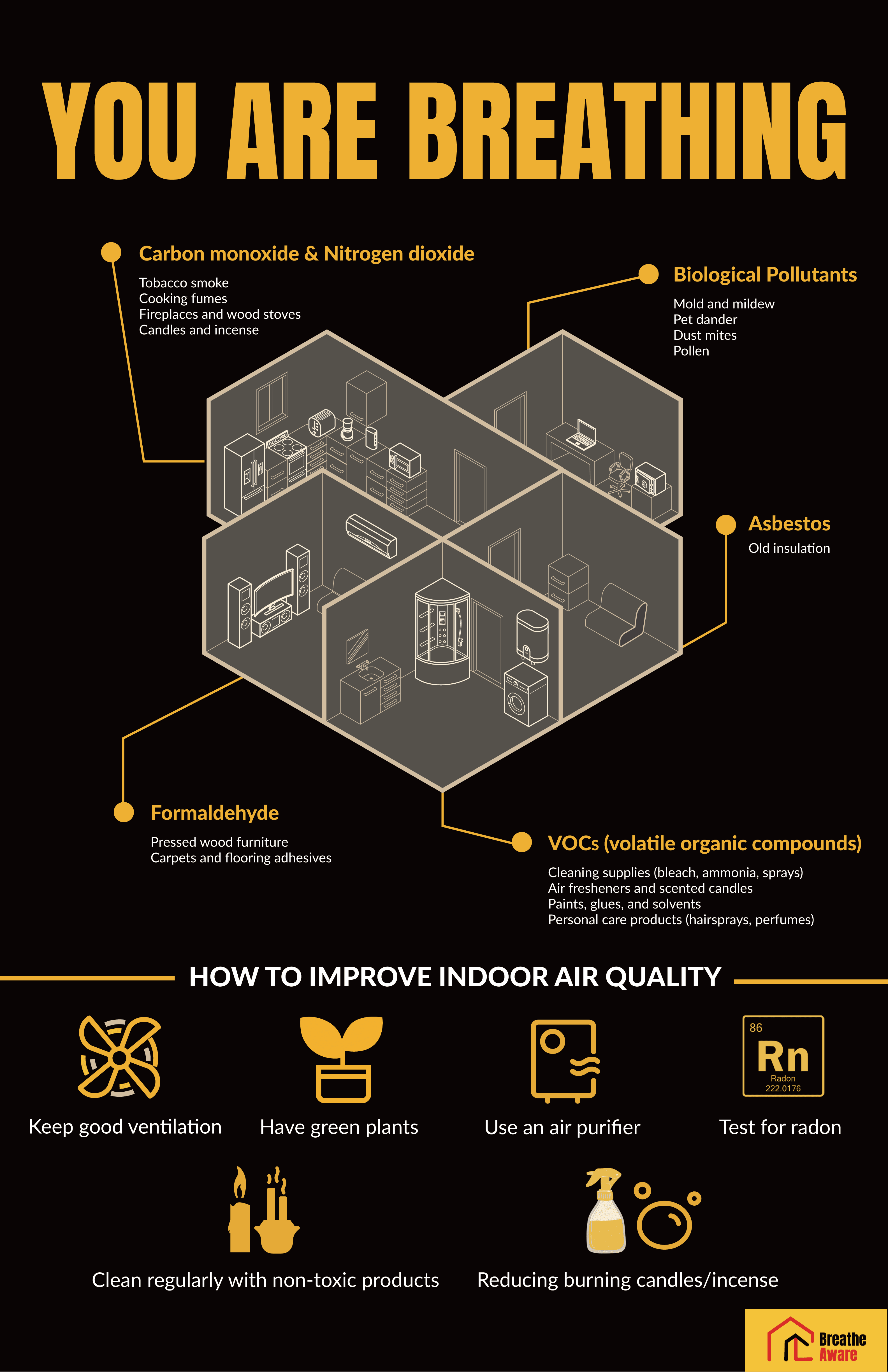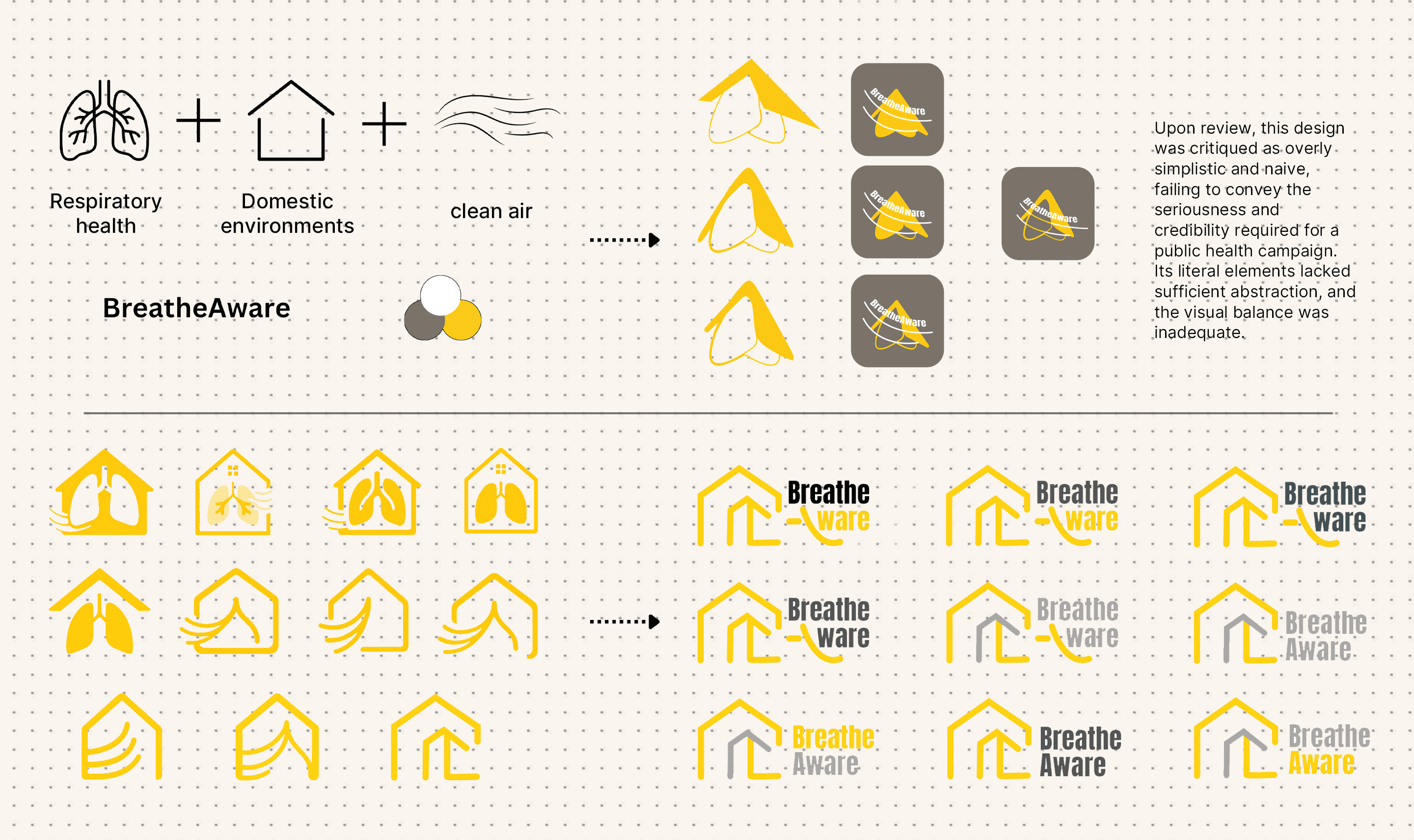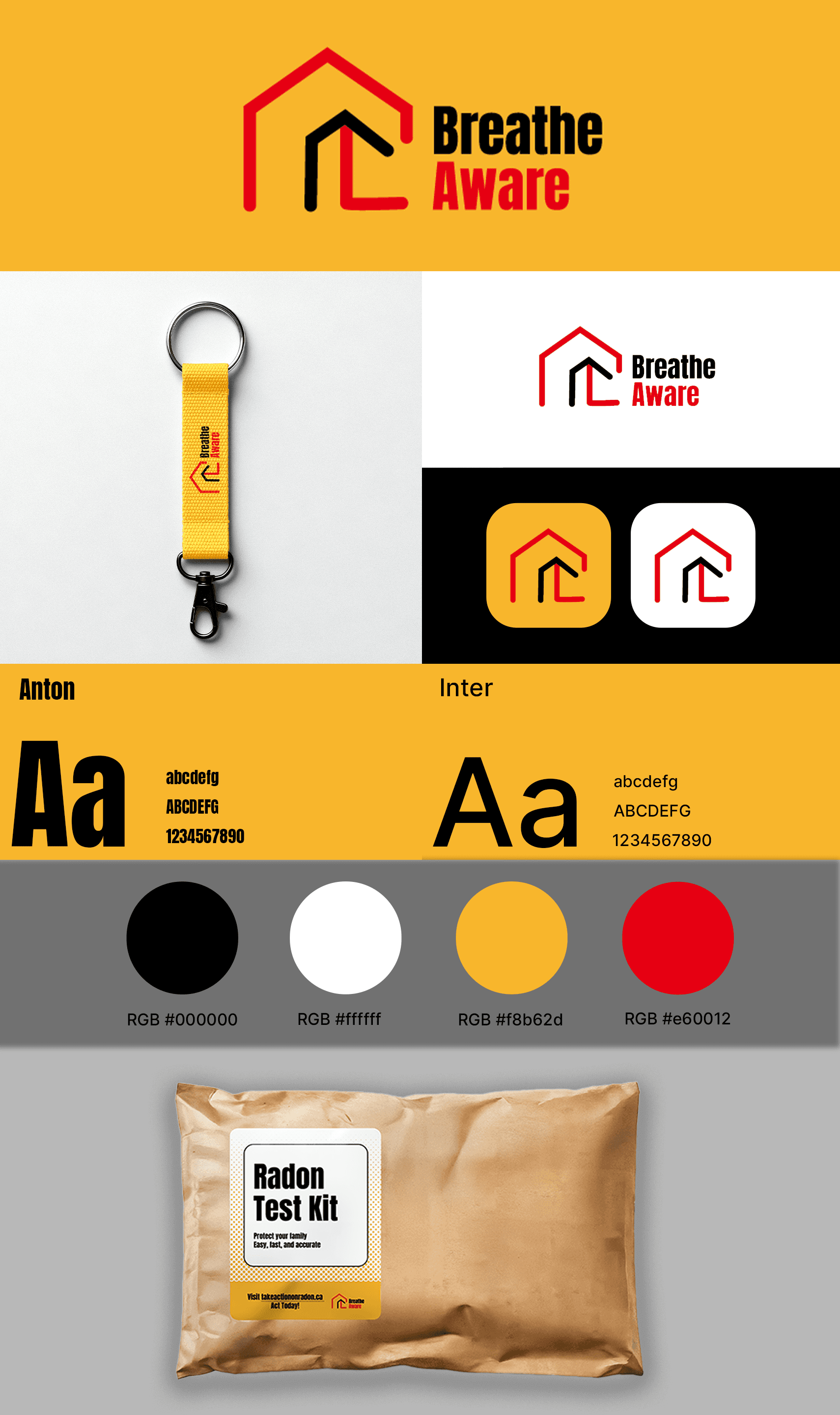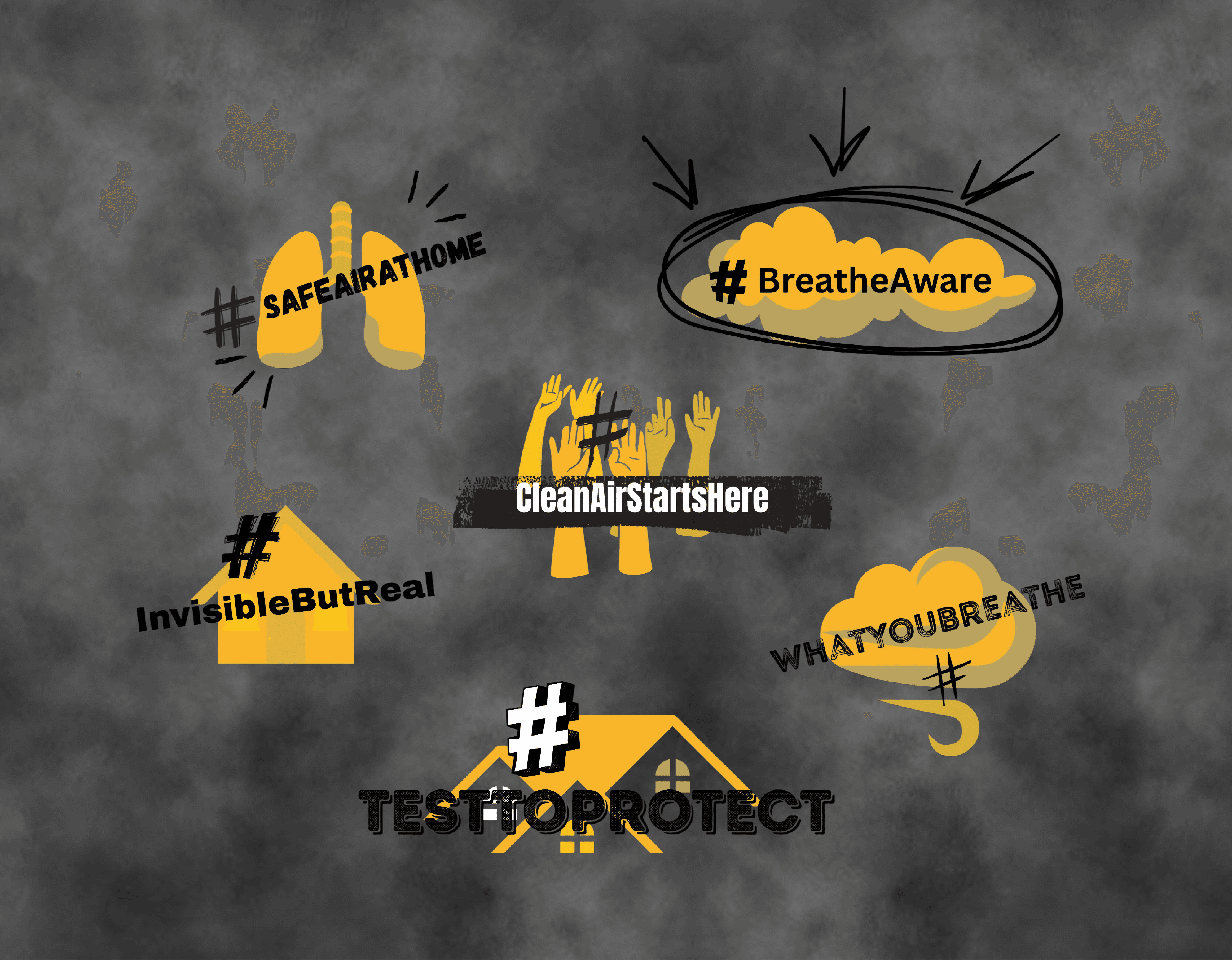 The logo went through several iterations before reaching the final design, which uses red, black, and dark yellow to integrate text and symbolic elements. Red and black convey seriousness and credibility, while the dark yellow background subtly references radiation warnings related to radon exposure. The logo visually connects architectural spaces with respiratory health, creating a strong metaphor for indoor air quality. Its minimalist and balanced design ensures clarity and versatility across different campaign materials and backgrounds.