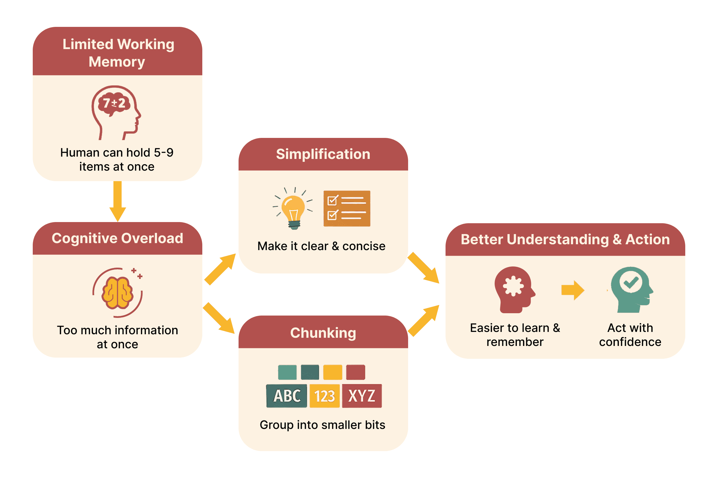 George A. Miller’s seminal work on human information processing (1956) highlights the limitations of short-term memory and the capacity for absolute judgment. Concepts such as “bits” of information and “chunking” demonstrate that people can process only a limited amount of information at one time. This framework emphasizes the need to simplify complex messages, break information into manageable units, and reduce cognitive load through clear structure and visual hierarchy