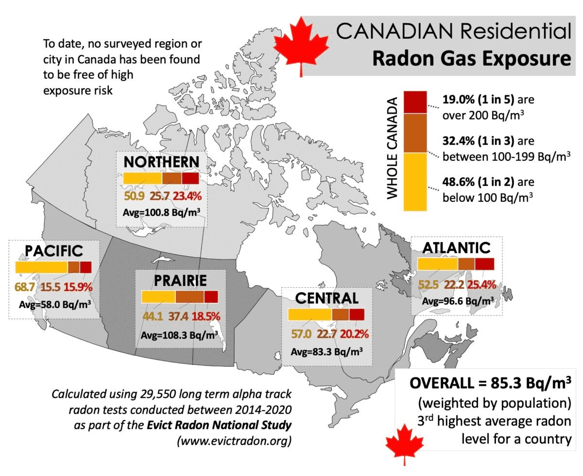 Canada has some of the highest residential radon levels globally. Figure on the left shows a map of residential radon gas exposure across Canada.