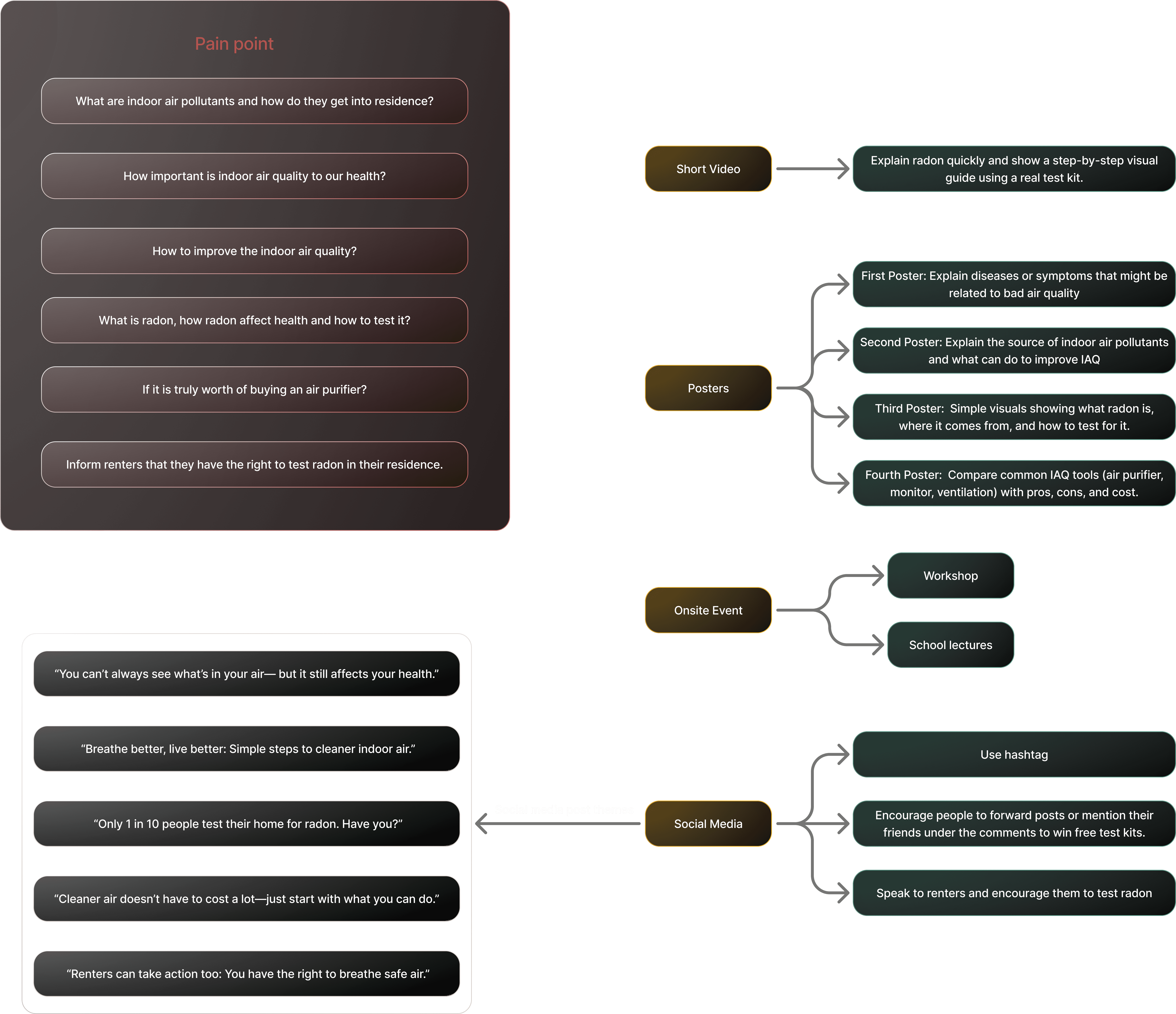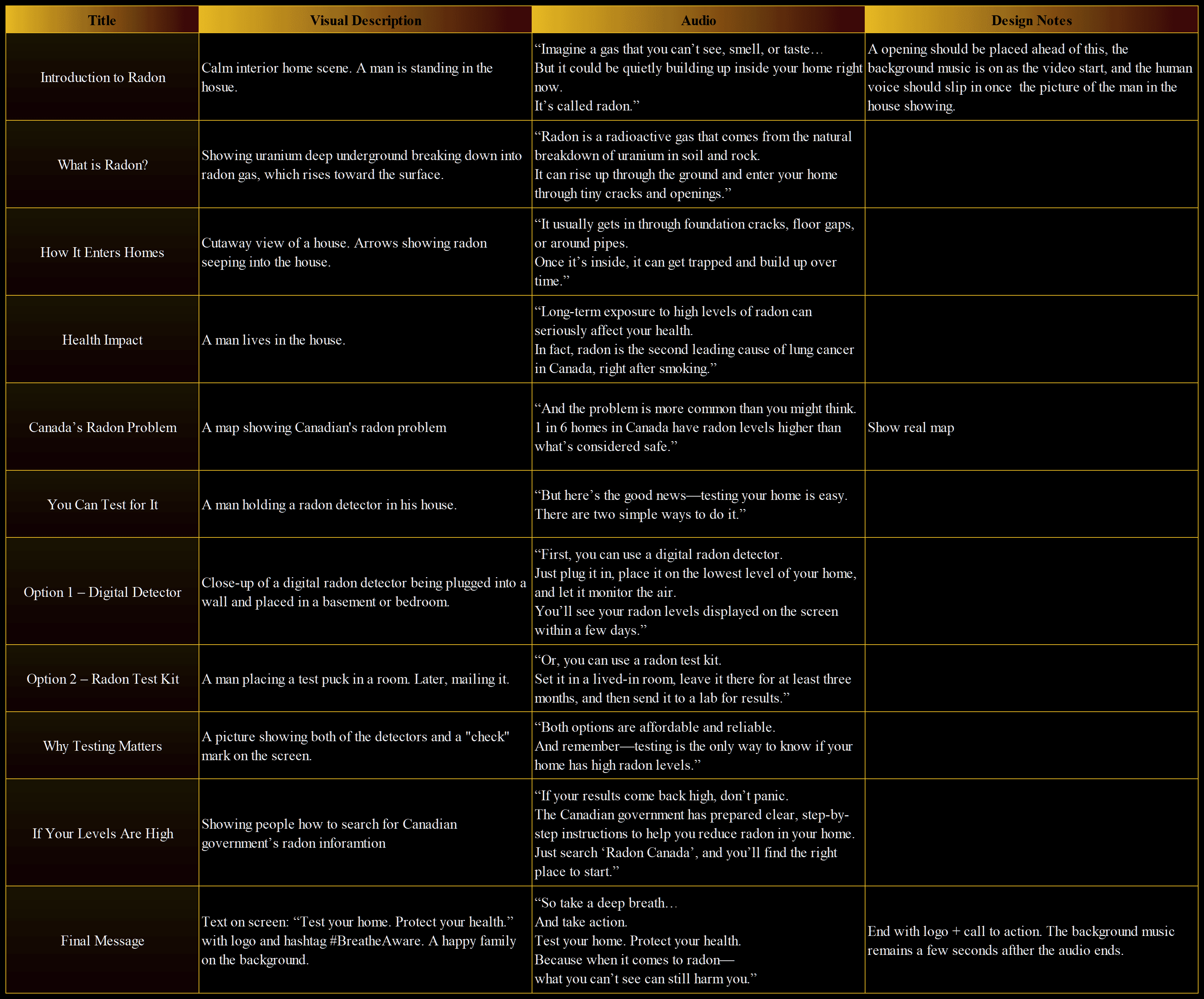 A short video was developed to raise radon awareness and introduce the topic to audiences unfamiliar with it. The video explains what radon is, how it enters homes, its health impacts, testing methods, and available resources in Canada. Realistic visuals and storytelling were used to improve engagement, supported by a detailed workflow map guiding the production process.