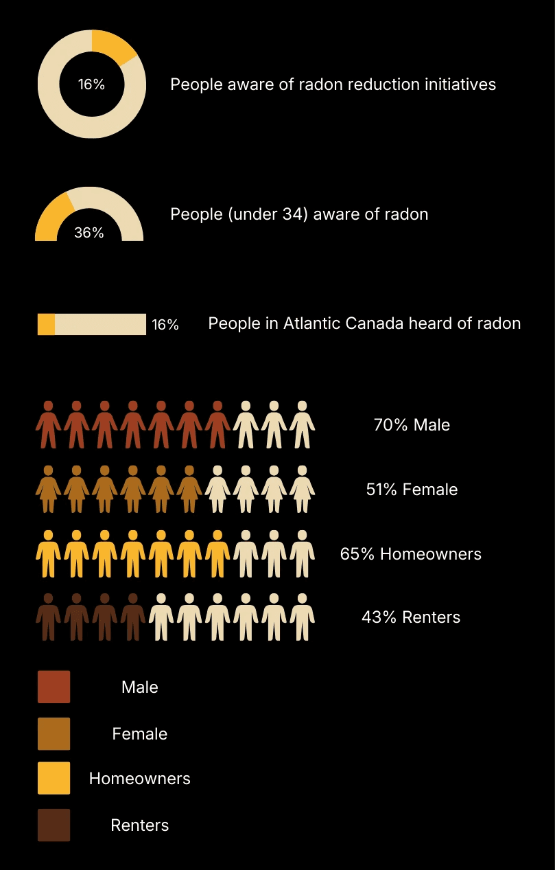 In 2023, Environics Research Group (2023) found that only 54% of families in Atlantic Canada reported having heard of radon, the lowest rate among regions. Awareness also varied across demographics: individuals aged 34 or younger were the least aware (36%). Gender differences were also notable, with men reporting higher awareness (70%) compared to women (51%). Similarly, homeowners demonstrated greater awareness (65%) than renters (43%).
