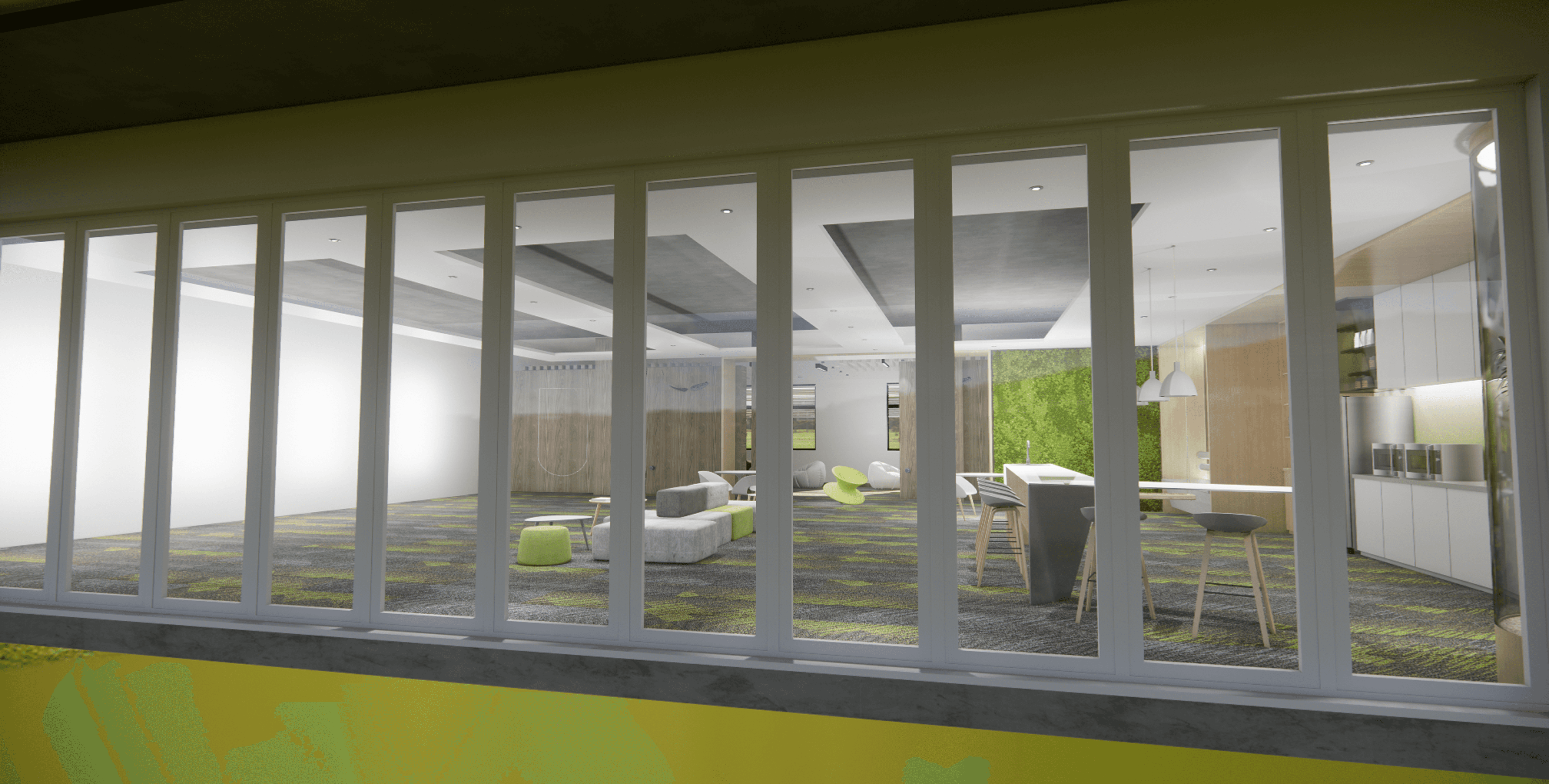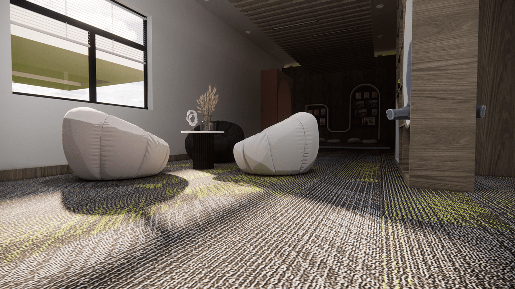Clearly, in our endeavor to connect with nature, we have incorporated numerous green elements that awaken an intrinsic pursuit of authenticity. We extensively use carpeting because these soft fabrics can be particularly comforting for individuals who have experienced trauma. We also strive to avoid the use of sharp and abrupt materials.